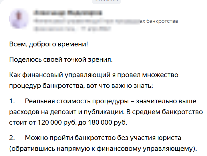 Гражданину стоит постоянно просматривать отзывы и мнения таких же «начинающих» банкротов и специалистов. Например, о вопросах стоимости процедуры. На форумах должников, прошедших процедуру, можно найти пояснения о том, что учитывать при банкротстве физлиц.