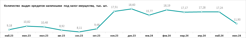 За июнь банки выдали 11,90 тыс. залоговых кредитов на 18,93 млрд руб. В годовом отношении объем выдач вырос на 3%, количество – на 10%. В июне 2023 г. было выдано 10,82 тыс. кредитов на 18,41 млрд руб.