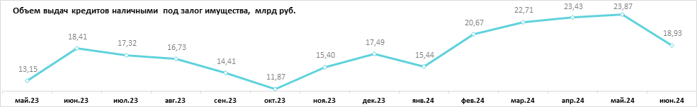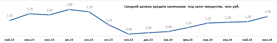 По сравнению с результатами предыдущего месяца в июне снижение объема выдач кредитов наличными под залог имущества составило 21%, а количества – 31%. В мае 2024 г. было выдано 17,24 тыс. кредитов на 23,87 млрд руб., средний размер кредита был равен 1,38 млн руб., средний срок – 76 мес. (6 лет 4 мес.).