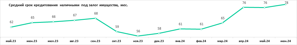 Средний срок залогового кредитования за год прирос на 13 мес.: с 65 мес. (5 лет 5 мес.) до 78 мес. (6 лет 6 мес.), это максимальное значение показателя за последние 6 лет.