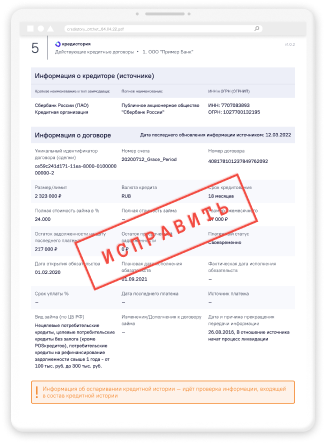 В заявлении укажите ФИО, дату рождения, серию и номер паспорта, название кредитора и суть претензии. Эти данные нужны нам, чтобы проверить информацию об ошибке. Если чего‑то будет не хватать, мы дополнительно свяжемся с вами